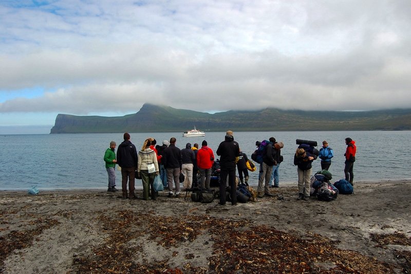Iš esamo kelto reikėjo perlipti į guminę motorinę valtį, kuri nuplukdė mus į krantą. Buvau toks laimingas, kuo greičiau šokau lauk iš valties ir nėriau į laukinę gamtą, norėjau naujų patyrimų ir išgyvenimų. Buvau toks greitas, kad net pamiršau visus naujus pirkinius maišelyje – jie liko laive. Kai susiprotėjau, laivas jau tolo nuo kranto, buvo per vėlu. Na ką padarysi, kaip nors išgyvensiu! Ypač nusiminiau kai sužinojau, kad Hornstrandir’e yra draudžiama kurti laužus, reikia naudoti dujų balionėlius, kurių aš neturiu.